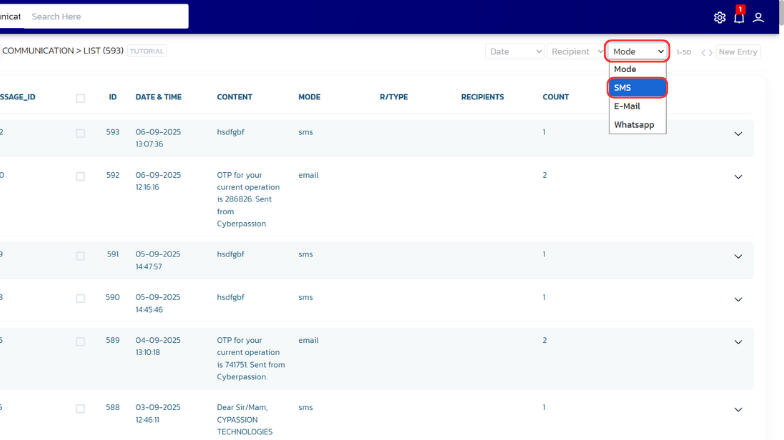 A page will open. At the top, under filters, click on Mode. A dropdown will appear. Select SMS.