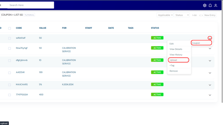 A list will appear. For the desired coupon, go to the right side and hover over the Arrow icon. Then hover over Coupon and click on Upload.