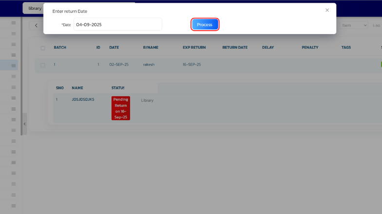 Enter the return date and click on Process.