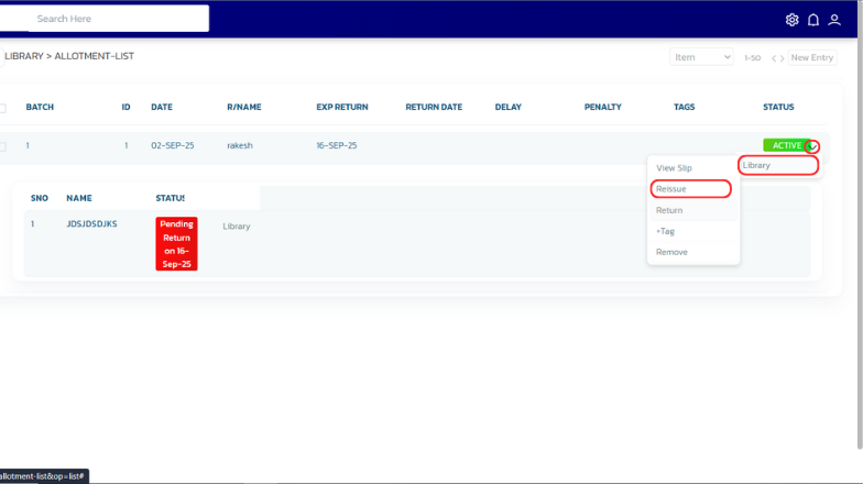 A page will open showing all the allotment items. For the desired item, hover over the arrow icon on the right, then hover over Library, and click on Return.
