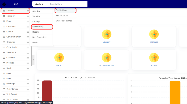 On the left sidebar, hover over Student. A submenu will appear. Hover over Fee Settings, then from the next submenu, click on Fee Settings.