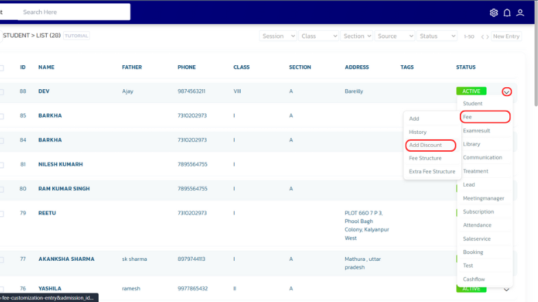 A list of students will be displayed. For the student you want to add a discount to, hover over the arrow icon on the right. A submenu will appear. Hover over Fees, then from the next submenu, click on Add Discount.