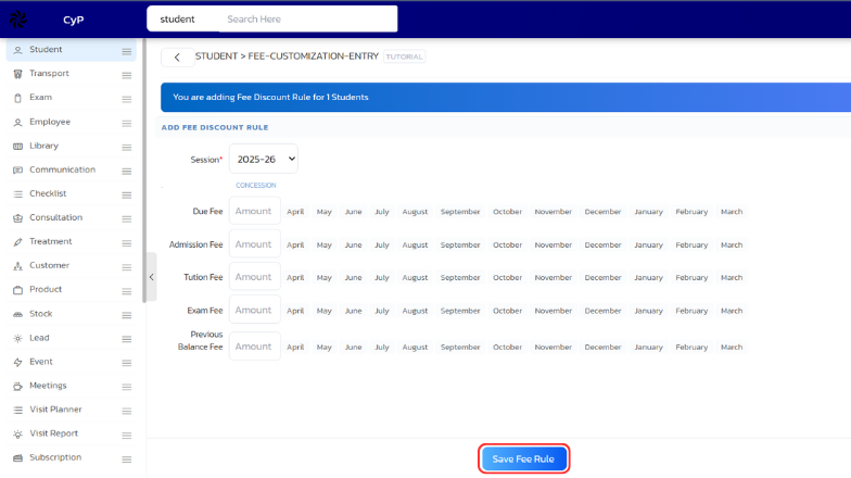 A page will open. Enter the fee discount rule and click on Save Fee Rule.