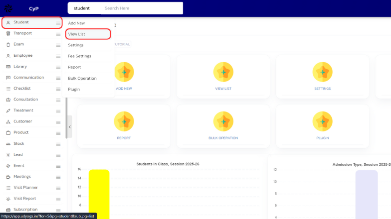 On the left sidebar, hover over Student. A submenu will appear. Click on View List.