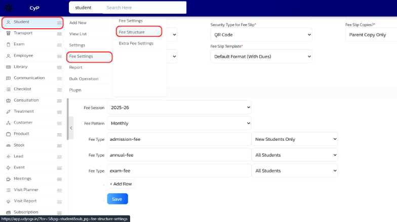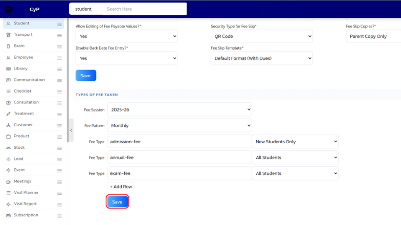 A page will open. Scroll down to the section Type of Fee Taken. Click on Add Row, enter the fee name, and from the dropdown menu, select which students will pay the fee (All, New, or Old).