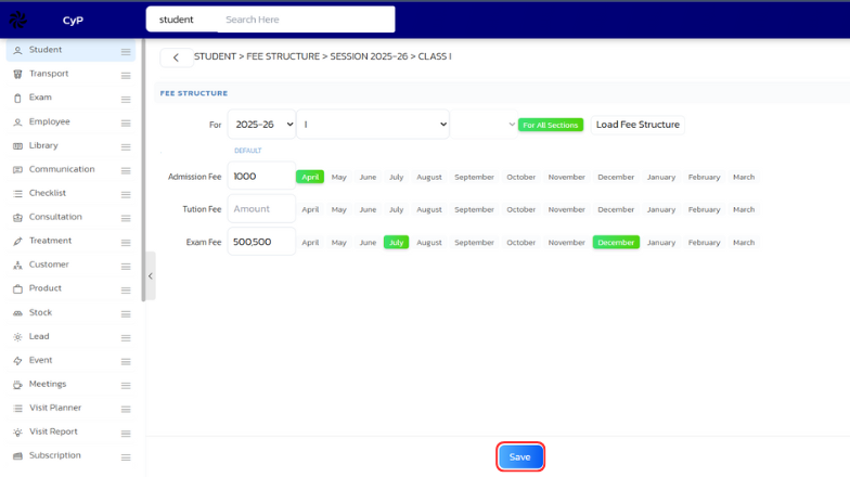 On the left sidebar, hover over Student again. A submenu will appear. Hover over Fee Settings, then from the next submenu, click on Fee Structure.