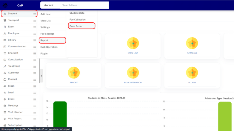 On the left sidebar, hover over Student. A dropdown will appear. Hover over Report, then from the submenu, click on Dues Report.