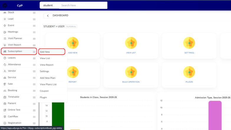 Hover on "Subscription" module visible on the left sidebar menu.