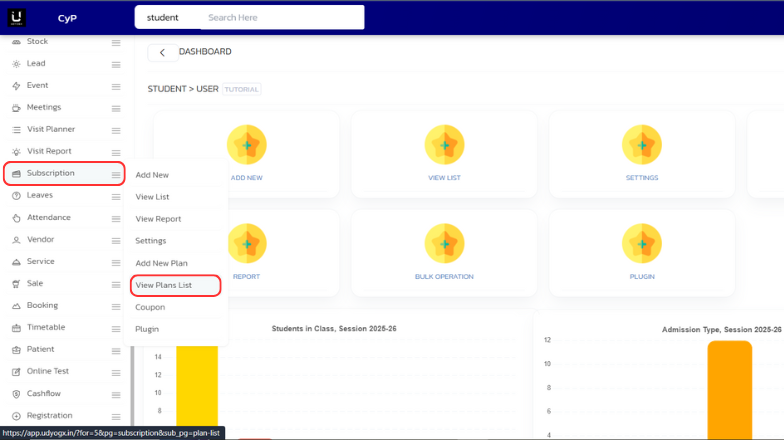 On the left sidebar, hover over Subscription. A submenu will appear. Click on View Plans List.