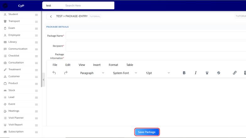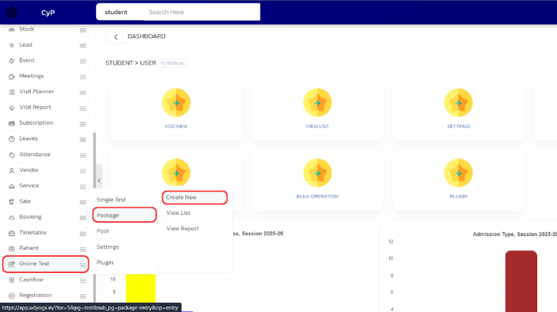 On the left sidebar, hover over Online Test. A submenu will appear. Hover over Package, then from the next submenu, click on Create New.
