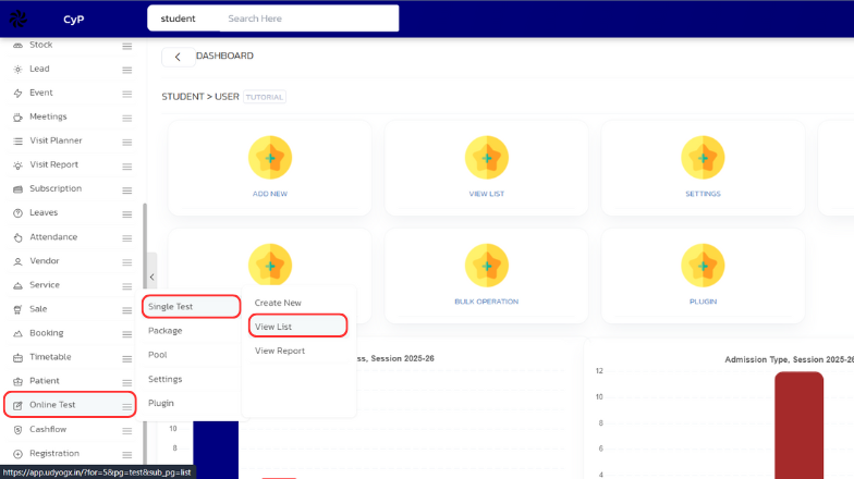 In the left sidebar menu, go to 'Online Test > Single Test > View List'.