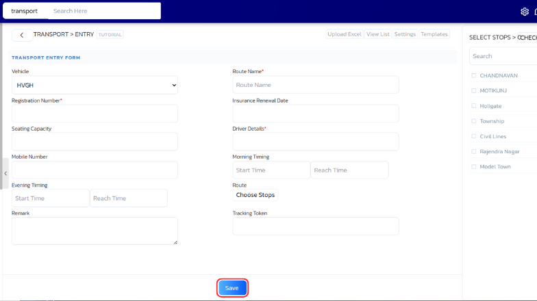 - You will enter vehicle details in this form like Route Name and Vehicle Detail, Driver Details and other details. Star (*) marked entries are mandatory.