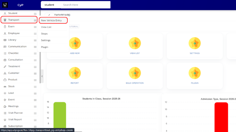 - In the left sidebar menu,, hover on Transport, then click on New Vehicle Entry.
