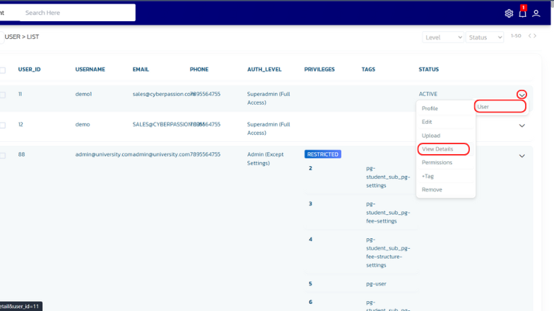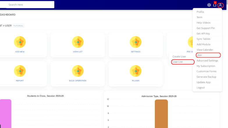 Hover on User, a dropdown will appear, click on the User List option from the dropdown.