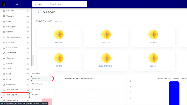 In the left sidebar menu, go to ‘Visit Report > View List’.