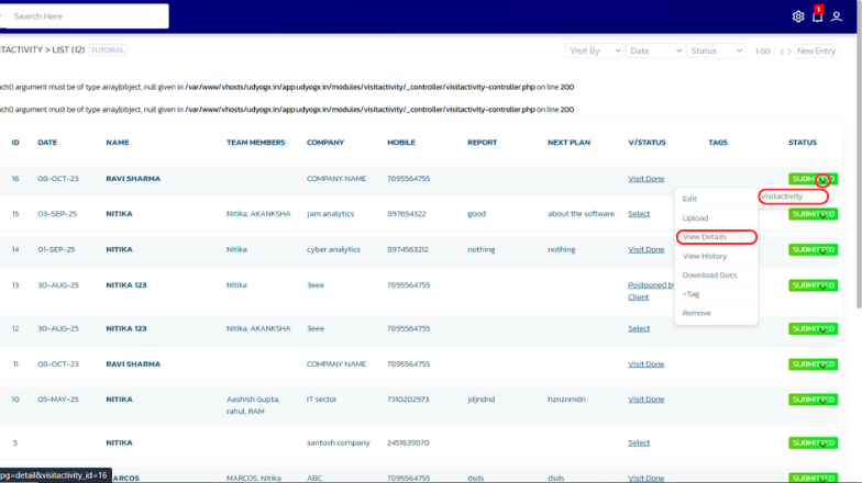 A dropdown menu would appear. Select 'Visitactivity > View Details'.